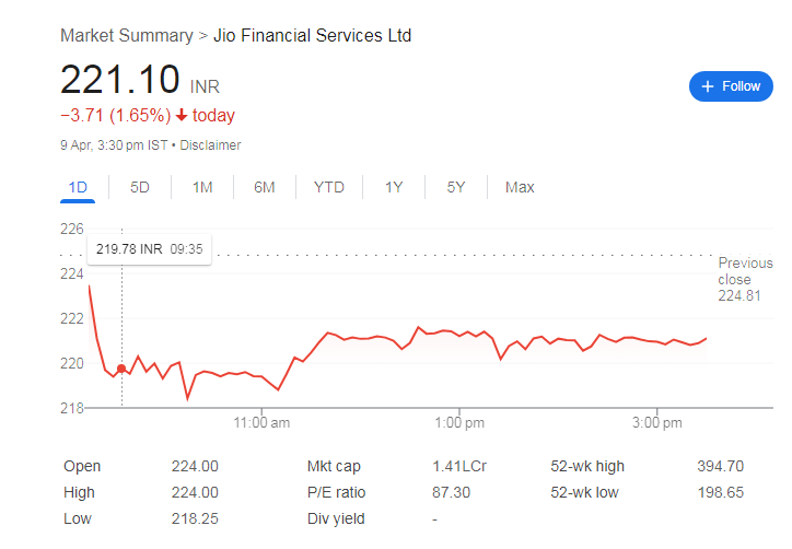 जियो फाइनेंशियल सर्विसेज का शेयर प्रदर्शन (9 अप्रैल 2025)