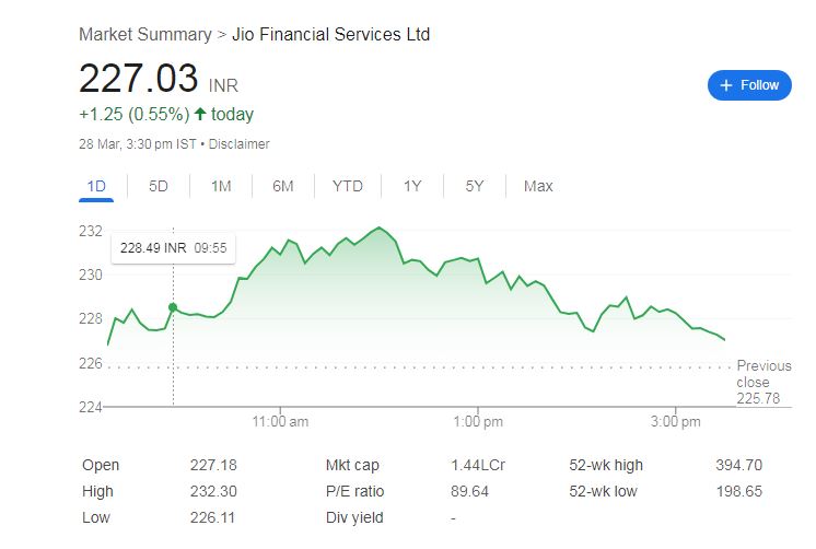 जियो फाइनेंशियल सर्विसेज लिमिटेड के स्टॉक में 28 मार्च को 0.55% की तेजी आई। यह शेयर 227.03 रुपये पर कारोबार कर रहा था। सुबह ट्रेडिंग शुरू होने के साथ ही स्टॉक 227.18 रुपये पर ओपन हुआ। दिन के दौरान इसने 232.30 रुपये का उच्चतम स्तर छुआ, जबकि इसका न्यूनतम स्तर 226.11 रुपये रहा।