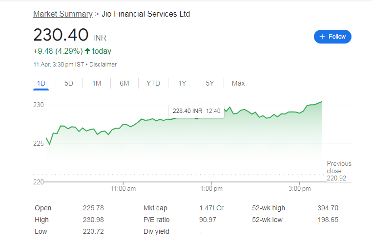 Jio Finance Share Price: रॉकेट सा उड़ा जियो फाइनेंशियल का यह स्टॉक, शेयर में 4.29% की जबरदस्त उछाल