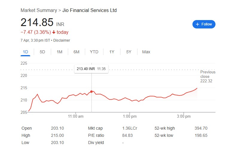 जियो फाइनेंशियल के शेयर में 3.36% की गिरावट