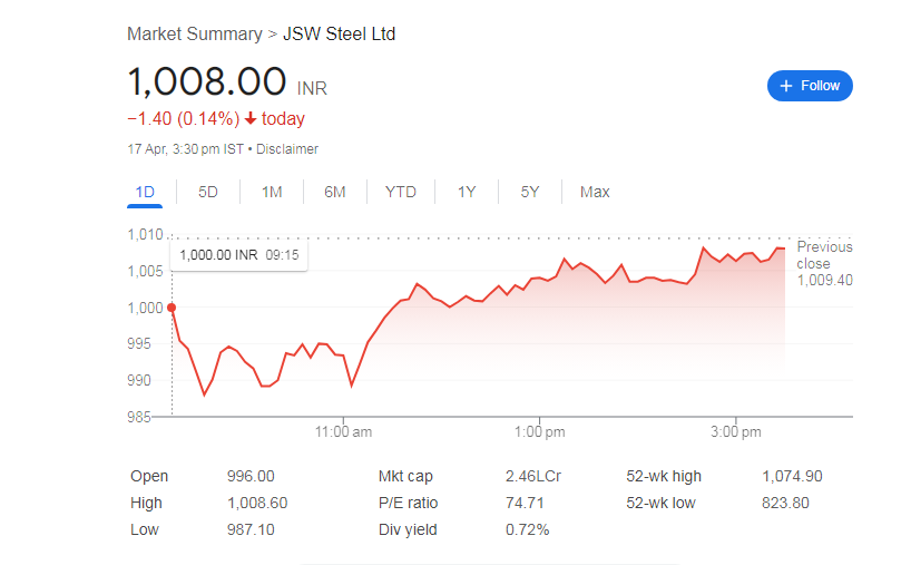 तेजी के बाजार के बीच JSW स्टील के शेयर में हल्की गिरावट देखी गई। यह शेयर गुरुवार को 996 रुपये पर खुला और दिन में 987.10 रुपये के लो को छुआ। हालांकि, दोपहर तक यह 1008.60 रुपये के हाई तक पहुंच गया। लेकिन आखिर में यह शेयर 1008 रुपये पर बंद हुआ, जो कि -0.14% की गिरावट को दर्शाता है।