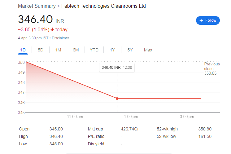 कंपनी का 52 सप्ताह का उच्चतम मूल्य 350.80 रुपये और न्यूनतम मूल्य 161.50 रुपये है। इसका मार्केट कैप 426.74 करोड़ रुपये है। जब से कंपनी लिस्ट हुई है, इसके शेयरों में कोई नकारात्मक ट्रेंड नहीं देखा गया है। फैबटेक टेक्नोलॉजीज क्लीनरूम्स के शेयरों का प्रदर्शन मजबूत बना हुआ है। अगले दिन भी इसके शेयरों में हल्की हलचल हो सकती है, लेकिन कंपनी के शानदार प्रदर्शन और नई योजनाओं के चलते शेयरों में वृद्धि की संभावना बनी रह सकती है।
