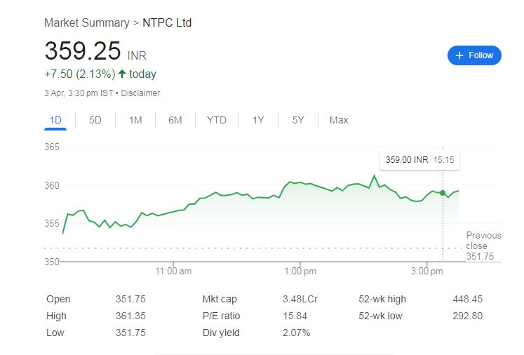 - एनटीपीसी के स्टॉक में 2.13% की तेजी, 359.25 रुपये पर कारोबार।