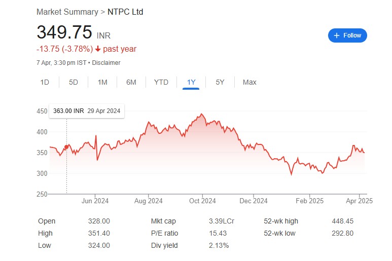 NTPC Share Price: सोमवार, 7 अप्रैल 2025 को ग्लोबल मार्केट से मिले-जुले संकेतों के बीच भारतीय शेयर बाजार की शुरुआत भारी गिरावट के साथ हुई। BSE सेंसेक्स करीब 2226 अंक गिरकर 73,137.90 पर पहुंच गया, वहीं NSE निफ्टी भी 742 अंक गिरकर 22,161.60 के स्तर पर आ गया। इस गिरावट का असर NTPC के शेयर पर भी पड़ा, जिसमें हल्की कमजोरी देखने को मिली। दोपहर 3:30 बजे तक NTPC का स्टॉक 0.19% गिरकर 349.75 रुपये पर कारोबार कर रहा था।