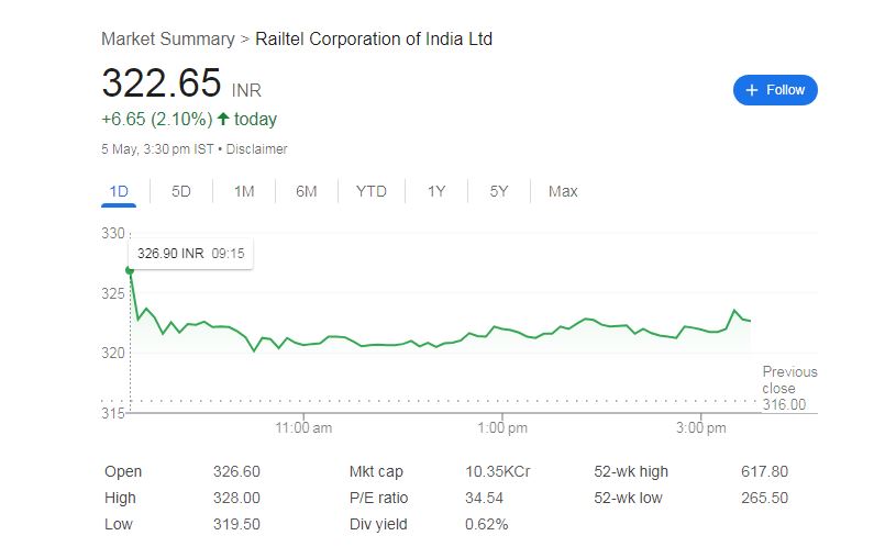 RailTel Share Price: रेलवे से जुड़ी कंपनी रेलटेल कॉर्पोरेशन ऑफ इंडिया लिमिटेड के शेयरों में बड़ी तेजी देखने को मिली है। 5 मई को यह शेयर इंट्राडे में 4% चढ़कर 328 रुपये तक पहुंच गया। बीते दो दिनों में इसमें कुल 10% से अधिक की तेजी दर्ज की गई है। इस तेजी का सबसे बड़ा कारण मजबूत तिमाही नतीजे और मिले नए प्रोजेक्ट्स है, जिससे निवेशकों का भरोसा मजबूत हुआ है।