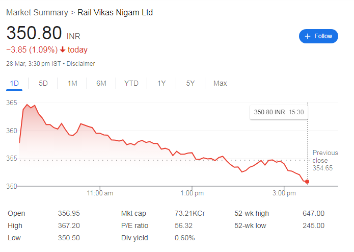 - रेल विकास निगम लिमिटेड के शेयर में -1.09% की गिरावट आई और यह 350.80 रुपये पर बंद हुआ।