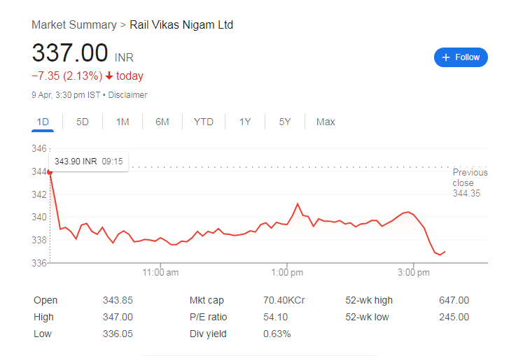 - रेल विकास निगम के स्टॉक में 9 अप्रैल को 2.13% की गिरावट आई।