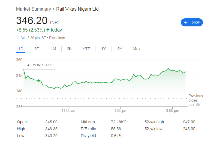 शुक्रवार 11 अप्रैल 2025 को RVNL के शेयर 345 रुपये पर ओपन हुआ और करीब 3% की तेजी के साथ 346.20 रुपये तक पहुंच गया। पिछले एक महीने में कंपनी के शेयरों में 4.73% की बढ़ोतरी दर्ज की गई है। वहीं, एक साल के दौरान कंपनी ने निवेशकों को 33% से अधिक का शानदार रिटर्न दिया है।