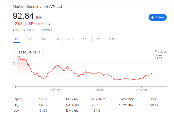 - वर्तमान में एसजेवीएन लिमिटेड का स्टॉक 92.84 रुपये पर बंद हुआ।