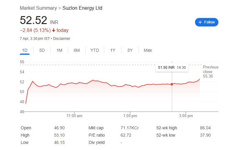Suzlon Energy Stock Price: 7 अप्रैल 2025 को भारतीय शेयर बाजार में बड़ी गिरावट देखी गई और इसका असर सुजलॉन एनर्जी के शेयर पर भी पड़ा। कंपनी का शेयर 5.13% टूटकर 52.52 रुपये पर बंद हुआ। इससे पहले 7 मार्च को यह शेयर 52.13 रुपये के स्तर तक गिर गया था।