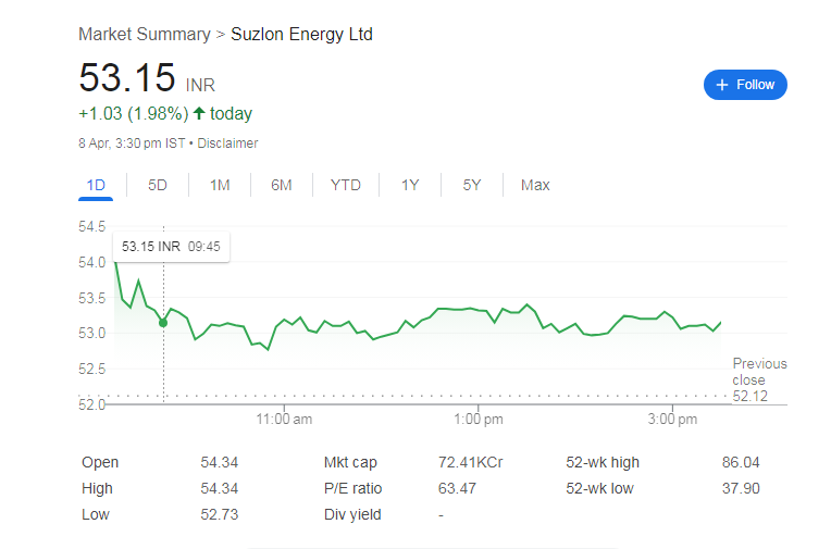 Suzlon Share Price: मंगलवार, 8 अप्रैल 2025 को सुजलॉन एनर्जी लिमिटेड के स्टॉक में 1.98% की तेजी आई, जिससे यह 53.15 रुपये पर कारोबार कर रहा था। सुबह ट्रेडिंग के दौरान सुजलॉन एनर्जी का स्टॉक 54.34 रुपये पर खुला और फिर यह 11:03 बजे तक 54.34 रुपये के हाई लेवल तक पहुंच गया। वहीं, दिन के दौरान इसका न्यूनतम स्तर 52.73 रुपये था। इन आंकड़ों के आधार पर सुजलॉन एनर्जी के स्टॉक में स्थिरता के साथ वृद्धि देखने को मिली।