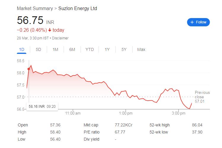 - 28 मार्च 2025 को सुजलॉन एनर्जी के शेयर में 0.46% की गिरावट आई, और इसका मूल्य 56.75 रुपये रहा।