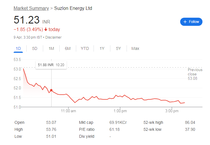 - सुजलॉन एनर्जी के शेयर में 3.49% की गिरावट आई, 51.23 रुपये पर बंद हुआ।