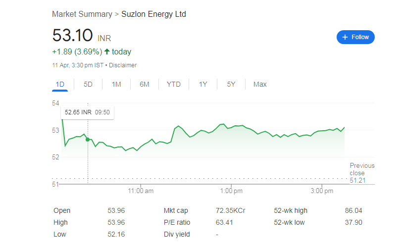 Suzlon Share Price: शुक्रवार, 11 अप्रैल 2025 को शेयर बाजार में सुजलॉन एनर्जी लिमिटेड के स्टॉक ने अच्छी तेजी दिखाई है। इस दिन कंपनी के शेयर में 3.69% की बढ़त दर्ज की गई और यह 53.10 रुपये पर कारोबार कर रहा था। ट्रेडिंग की शुरुआत में स्टॉक 53.96 रुपये पर खुला और यही दिन का सबसे हाई भी रहा। वहीं, इस दिन स्टॉक का सबसे लो लेवल 52.16 रुपये रहा।