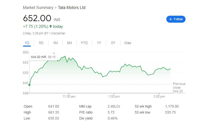 शुक्रवार को टाटा मोटर्स का शेयर 1.20% चढ़कर 652 रुपये पर बंद हुआ। हालांकि, पिछले एक साल में इसमें 36% की गिरावट आई है। कंपनी का 52-वीक हाई 1179 रुपये और लो 535.75 रुपये है। मौजूदा मार्केट कैप 2.40 लाख करोड़ रुपये है। सभी की निगाहें अब 14 मई के तिमाही नतीजों पर टिकी हैं।