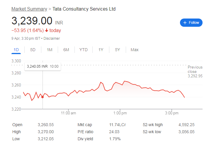 TCS के शेयर की वर्तमान स्थिति (9 अप्रैल 2025)