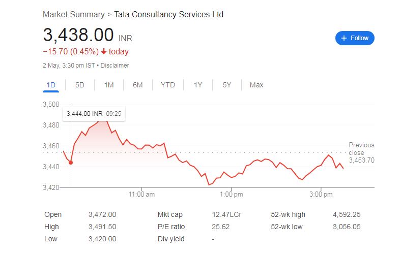 शुक्रवार को टाटा कंसल्टेंसी सर्विसेज (TCS) के शेयर में हल्की गिरावट देखने को मिली है। नेशनल स्टॉक एक्सचेंज के अनुसार, TCS का शेयर 3.30 बजे तक 0.45% गिरकर 3,438 रुपये पर बंद हुआ। ट्रेडिंग की शुरुआत में यह शेयर 3,472 रुपये पर खुला था और दिन में 3,491.50 रुपये के हाई और 3,420 रुपये के लो लेवल तक पहुंच गया।