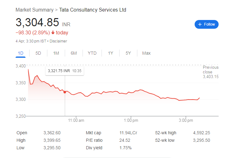 - टाटा कंसल्टेंसी सर्विसेज के शेयर में 4 अप्रैल को 2.89% की गिरावट आई।
