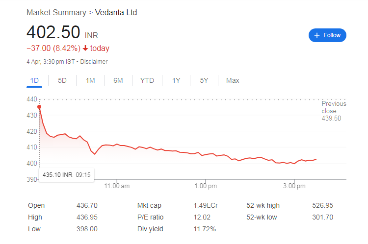 - वेदांता के शेयर में शुक्रवार को 8.42% की गिरावट आई और 402.50 रुपये पर बंद हुआ।