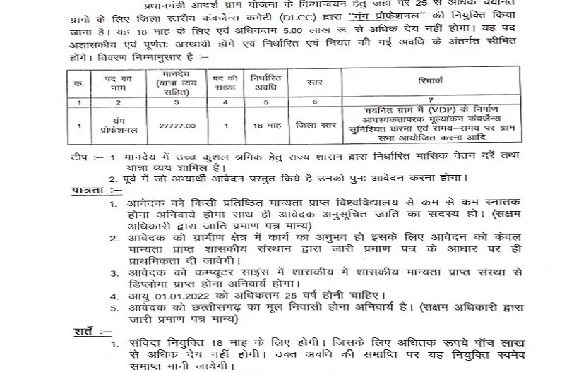 बलौदाबाजार । रोजगार की तलाश कर रहे युवाओं के लिए नौकरी करने का सुनहरा अवसर है। प्रधानमंत्री आदर्श ग्राम योजना के कियान्वयन हेतु छत्तीसगढ़ जिला बलौदाबाजार के द्वारा यंग प्रोफेशनल के रिक्त पदों पर भर्ती के लिए आवेदन पत्र आमंत्रित किया गया है, जिसके अनुसार इच्छुक उम्मीदवार 31.10.2022 तक ऑफलाइन आवेदन कर सकते है। चयनित उम्मीदवारों की संविदा नियुक्ति 18 माह के लिए होगी। जिसके लिए अधितक रूपये पॉच लाख से अधिक देय नहीं होगी। उक्त अवधि की समाप्ति पर यह नियुक्ति स्वमेव समाप्त मानी जायेगी।