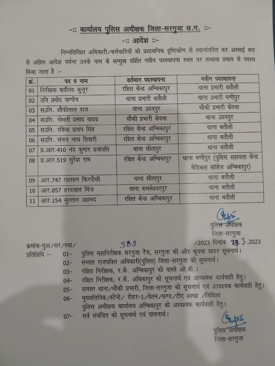 CG News : पुलिस विभाग में बड़ा फेरबदल, टीआई समेत 11 पुलिसकर्मियों का तबादला, 11 policemen including TI transferred in Surguja district