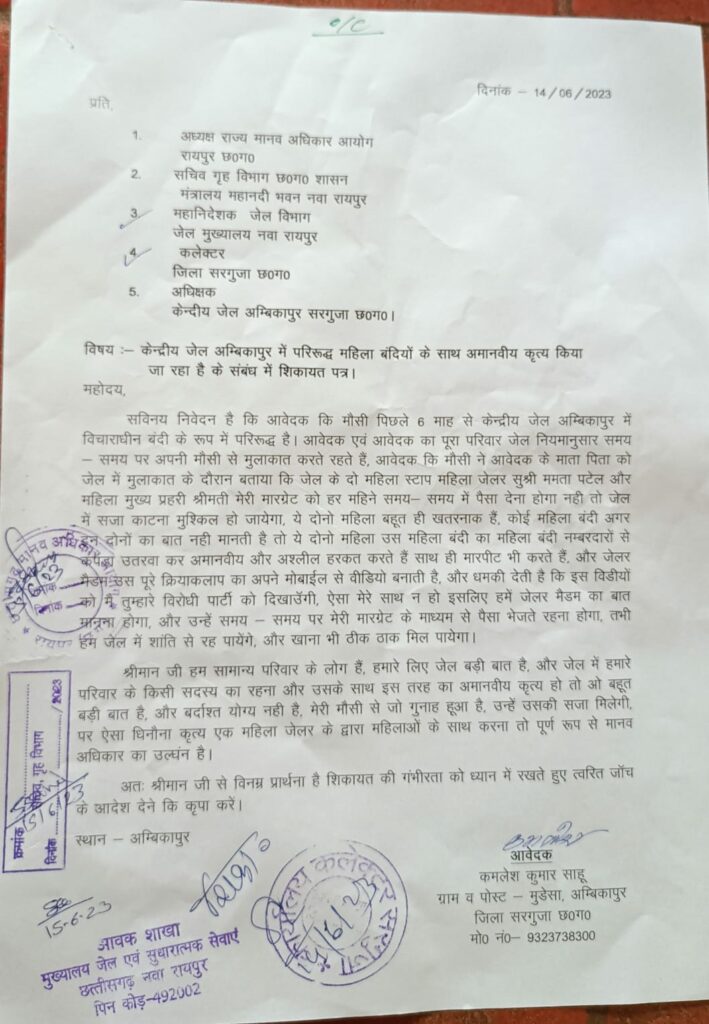 दरअसल मुडेसा के रहने वाले एक युवक ने राज्य मानवाधिकार, गृह विभाग, सरगुज़ा कलेक्टर समेत सेंट्रल जेल अम्बिकापुर के अधीक्षक को एक लिखित शिकायत दी है, जिसमें उसने कहा है कि उसकी एक रिश्तेदार अम्बिकापुर जेल में निरुद्ध है, जहां दो महिला प्रहरी बंदी महिला को प्रताडित करती हैं, उससे पैसे मांगे जाते हैं और पैसे नहीं दिए जाने पर महिला बंदियों के कपड़े उतरवाए जाते हैं और उसका वीडियो बनाकर वायरल करने की धमकी दी जाती है।