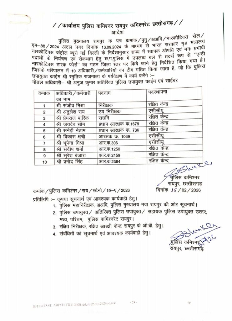 Anti Narcotics Task Force Raipur: TI संजीव मिश्रा, SI अतुलेश राय, ASI प्रेमराज बारिक, हवलदार जयदेव सोम, सनेही नेताम, आरक्षक विकास क्षत्री, भूपेन्द्र मिश्रा, संदीप शर्मा, सुरेश बंजारा, प्रमोद सिंह को रायपुर जिला एन्टी नारकोटिक्स टास्क फोर्स में शामिल किया गया है। भारत सरकार गृह मंत्रालय नारकोटिक्स कंट्रोल ब्यूरो नई दिल्ली के निर्देशों के बाद सभी जिलों में फ़ोर्स का गठन किया गया है। (Anti Narcotics Task Force Raipur) वहीं रायपुर कमिश्नर संजीव शुक्ला ने फ़ोर्स के गठन का लिखित आदेश जारी किया है।