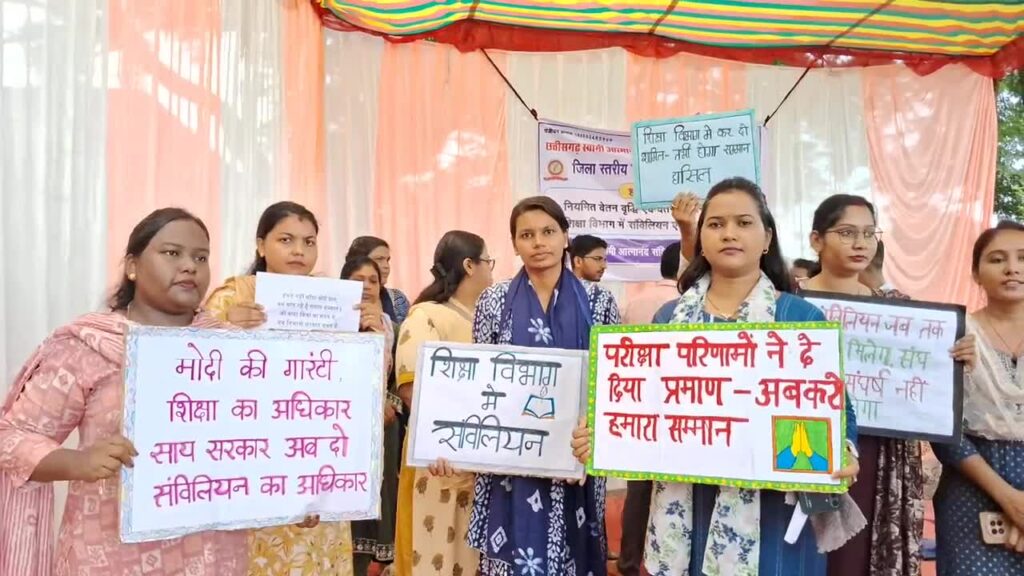 Chhattisgarh contract employees protest, छत्तीसगढ़ में स्वामी आत्मानंद उत्कृष्ट अंग्रेजी माध्यम स्कूलों के संविदा शिक्षक और कर्मचारी आज अपने वेतन निर्धारण और नियमितीकरण की मांग को लेकर सड़कों पर उतर आए। छत्तीसगढ़ स्वामी आत्मानंद संविदा शिक्षक एवं कर्मचारी संघ के तत्वाधान में, शिक्षकों ने खैरागढ़ के अम्बेडकर चौक पर एक दिवसीय सांकेतिक धरना प्रदर्शन किया।