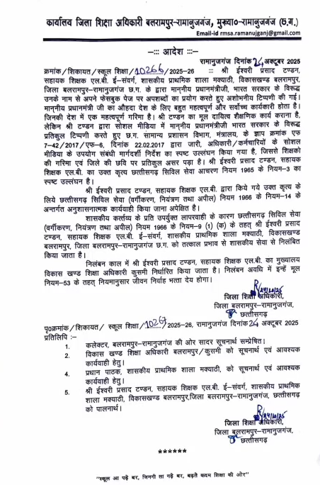 Balrampur News: जिला शिक्षा अधिकारी मनीराम यादव ने आदेश में बताया कि ईश्वरी प्रसाद टंडन द्वारा फेसबुक पर की गई टिप्पणी देश के प्रधानमंत्री के खिलाफ थी और यह छत्तीसगढ़ सामान्य प्रशासन विभाग द्वारा जारी अधिकारी-कर्मचारी के सोशल मीडिया उपयोग संबंधी निर्देशों का स्पष्ट उल्लंघन है। उन्होंने कहा कि यह कृत्य छत्तीसगढ़ सिविल सेवा आचरण नियम का भी उल्लंघन है इसलिए निलंबन कार्रवाई की गई है।