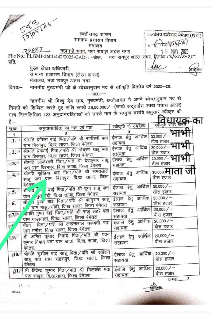 Bemetara News: साजा विधायक के PA, PSO, कंप्यूटर ऑपरेटर ने पहुंचाया अपने रिश्तेदारों को लाभ, स्वेक्षा अनुदान राशि में बंदरबांट की लिस्ट वायरल