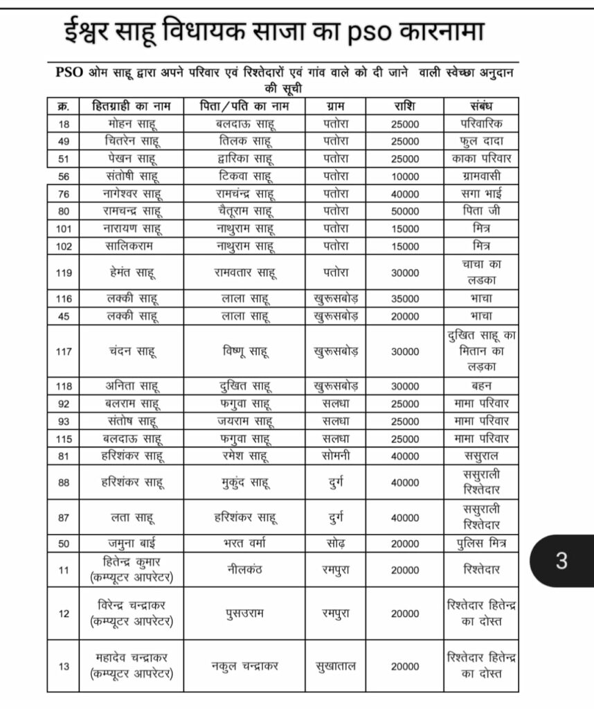 साजा विधायक ईश्वर साहू के PA दिग्विजय केशरी, PSO ओम साहू ,कंप्यूटर ऑपरेटर धीरज पटेल के मित्र, रिश्तेदार और परिवार से जुड़े लोगों के नाम सामने आ रहे हैं। अनुदान की राशि में भारी भरकम भ्रष्टाचार देख जा रहा है। इसे लेकर कांग्रेस ने भी अपने सोशल मीडिया में सूची को पोस्ट किया है और भाजपा विधायक पर तमाम आरोप लगाए हैं।