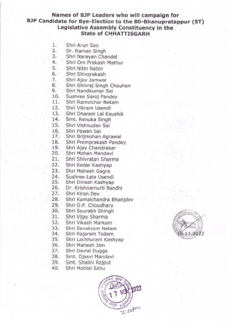 Bhanupratappur by-election 2022 : सूची में मध्यप्रदेश के मुख्यमंत्री शिवराज सिंह चौहान, बीजेपी प्रभारी ओम माथुर, नितिन नवीन, पूर्व सीएम डॉक्टर रमन सिंह, प्रदेश अध्यक्ष अरुण साव समेत 40 नेताओं के नाम शामिल हैं।