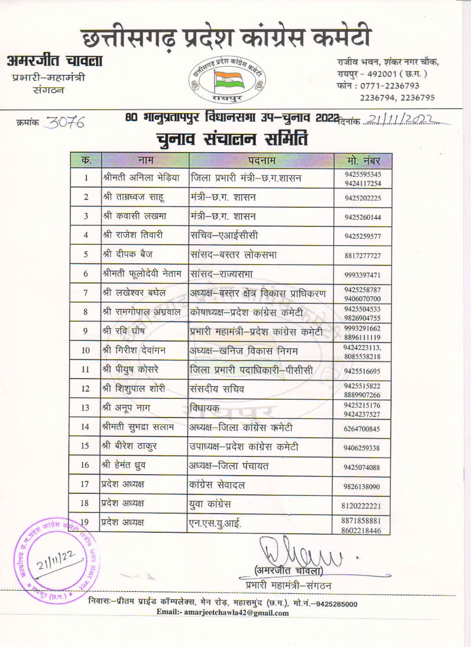 Bhanupratappur by-election : कांग्रेस ने की चुनाव संचालन समिति की घोषणा : Congress announces election steering committee