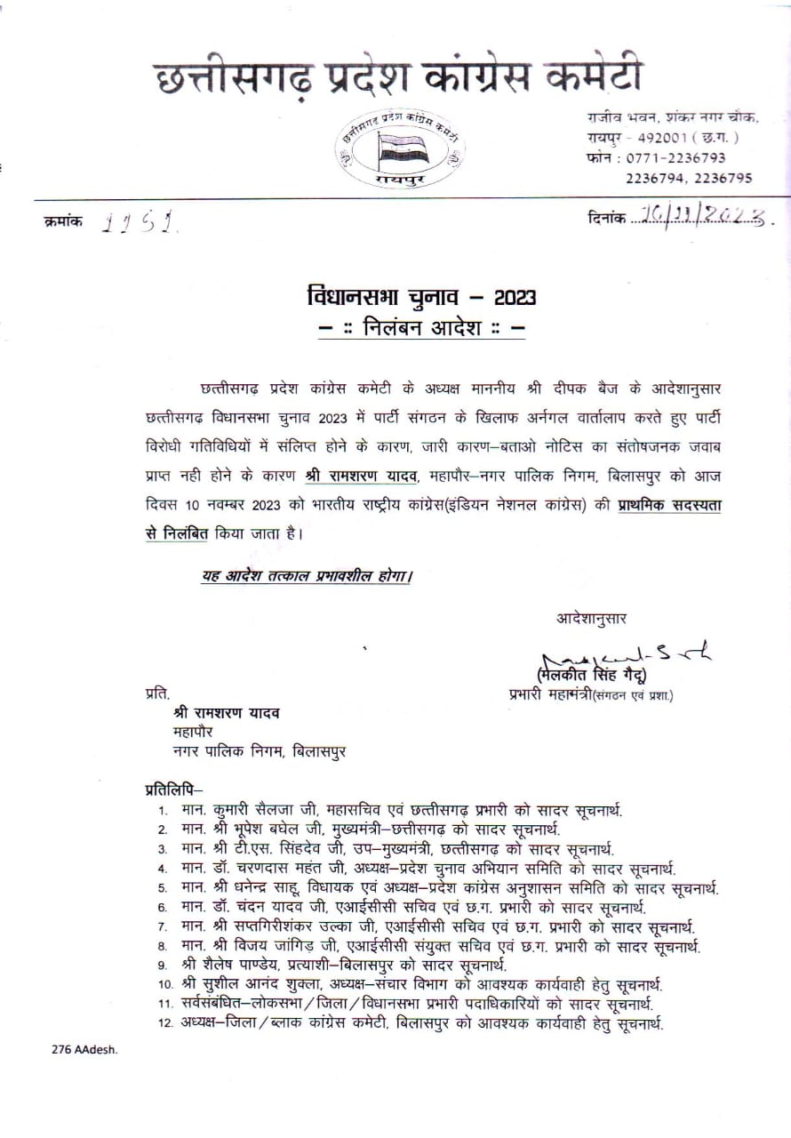 Action On Ramsharan Yadav: बिलासपुर महापौर रामशरण यादव पार्टी से 6 साल के लिए निष्कासित… प्राथमिक सदस्यता भी निलंबित, देखें आदेश