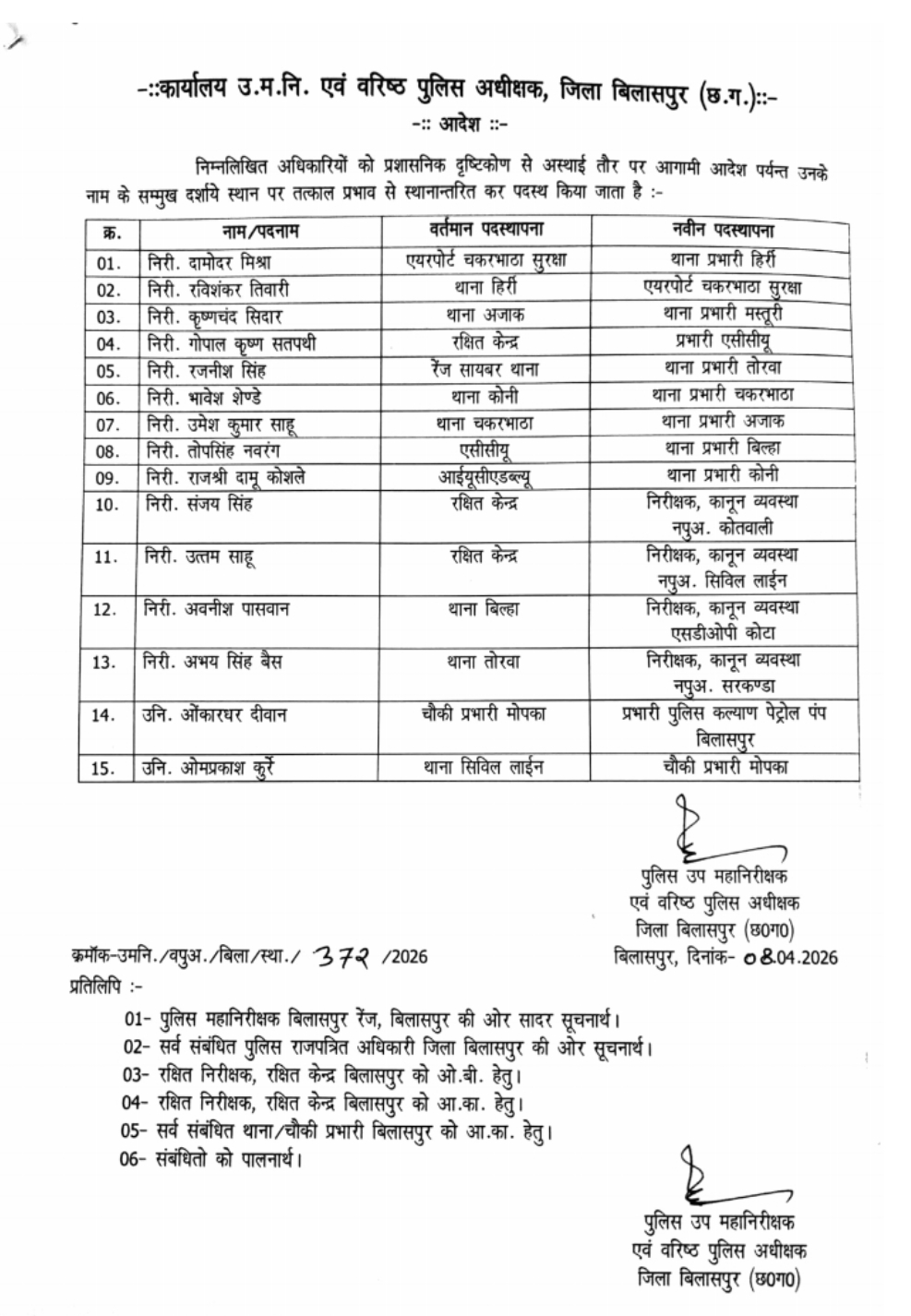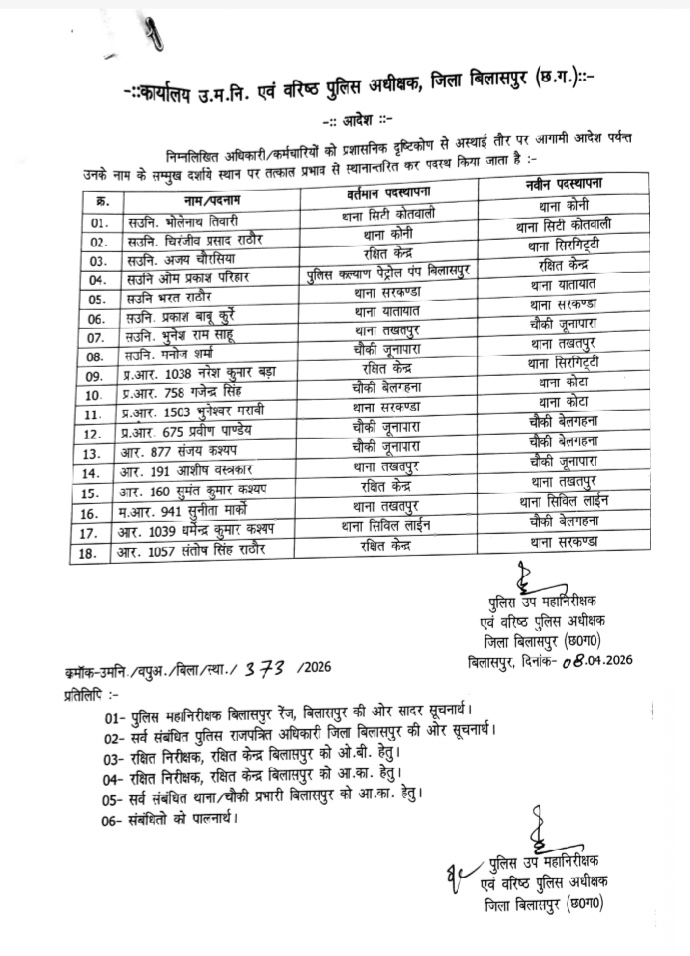 Bilaspur Police Transfer: छत्तीसगढ़ पुलिस में बड़ा फेरबदल, एक साथ बदले गए कई थानों के प्रभारी, 33 पुलिसकर्मी इधर से उधर