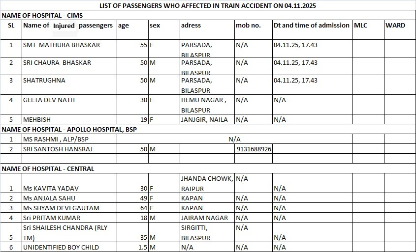 Bilaspur Train Accident: बिलासपुर ट्रेन हादसे में घायलों के नाम आए सामने, 14 लोगों का तीन हॉस्पिटल में इलाज जारी