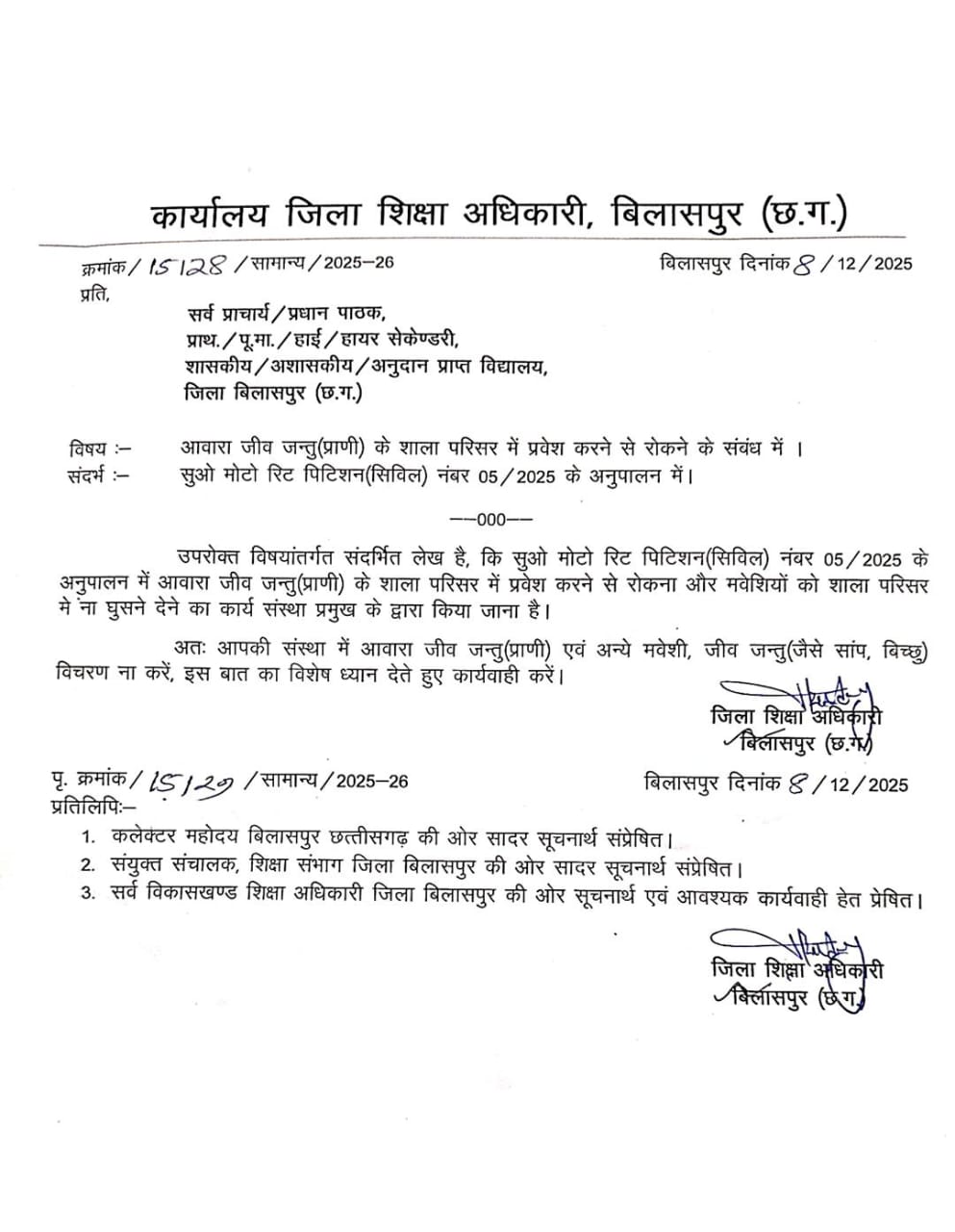 बिलासपुर: Chhattisgrah Teachers: सरकारी और निजी स्कूलों में अब शिक्षकों की निगरानी का दायरा बढ़ा दिया गया है। पहले आवारा कुत्ते और मवेशियों को रोकने का आदेश था लेकिन अब स्कूल परिसर के अंदर साँप, बिच्छू और अन्य जहरीले जंतुओं के प्रवेश पर भी रोक लगाने का निर्देश दिया गया है। डीपीआई से यह आदेश प्रदेश के सभी जिला शिक्षा अधिकारियों, प्राचार्यों और प्रधान पाठकों को दिया गया है। काम में टालमटोल न हो, इसके लिए सुप्रीम कोर्ट के आदेश का सीधा हवाला दिया गया है।