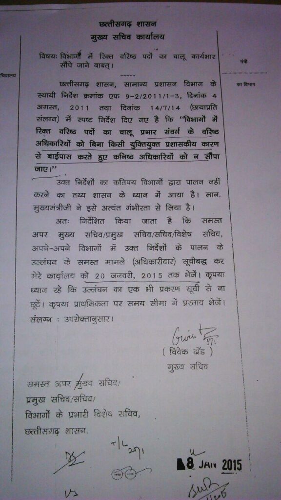 पोस्टिंग को नियमविरुद्ध बताया जा रहा है। शासन के आदेश के तहत विभागों में रिक्त वरिष्ठ पदों का चालू प्रभार संवर्ग के वरिष्ठ अधिकारियों को बिना किसी युक्तियुक्त प्रशासकीय कारण से बाईपास करते हुए कनिष्ठ अधिकारियों को नहीं सौंपना है। जबकि जारी आदेश में जूनियर को प्रभार दे दिया गया है। इधर रिटायरमेंट के दिन ही नियम विरुद्ध आदेश जारी करने को लेकर अब सवाल खड़े हो रहे हैं।