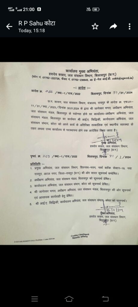 Illegal posting in Department of Water Resources: जूनियर अधिकारी आईए सिद्दीकी को एसई और प्रोबेशनर असिस्टेंट इंजीनियर प्रवीण कुमार को एसडीओ जल संसाधन-निर्माण उप संभाग बिलासपुर का चार्ज दिया गया है।