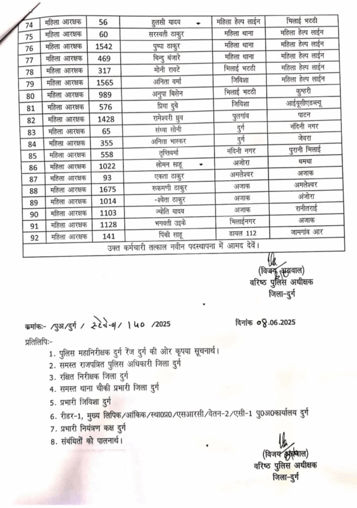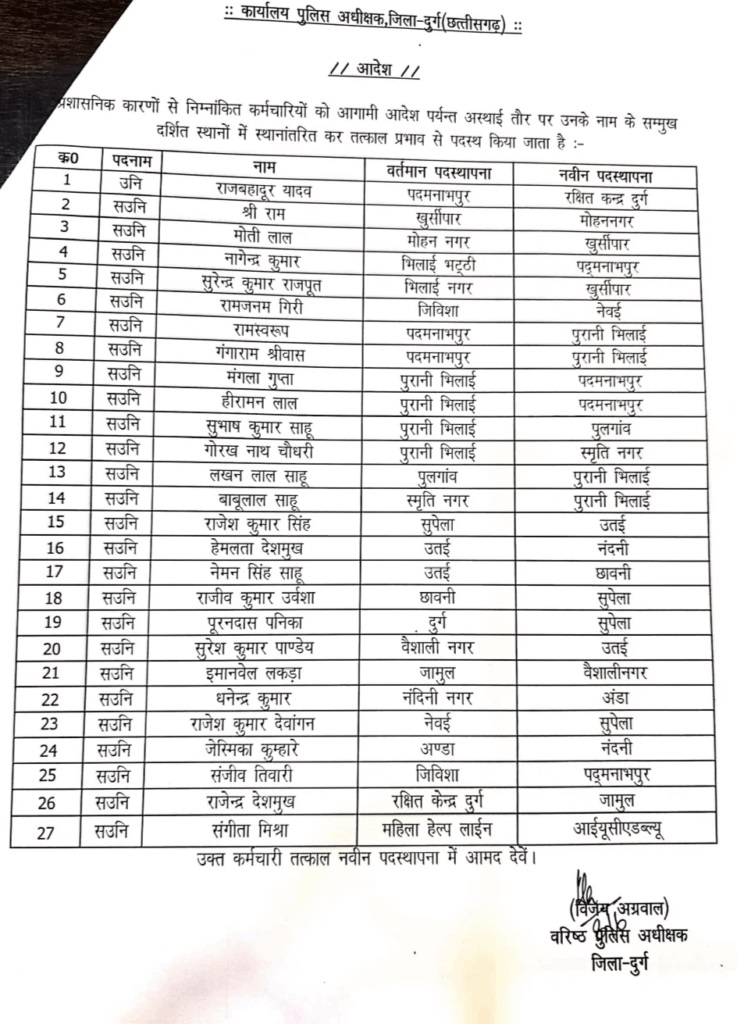 Durg Police Transfer एसएसपी विजय अग्रवाल ने एक महीने के अंदर ये तीसरी जंबो ट्रांसफर लिस्ट जारी की है। इससे पहले इन्होंने 18 मई को 53 और 17 मई को 12 पुलिस अधिकारियों और कर्मचारियों का ट्रांसफर ऑर्डर जारी किया था। इस तरह लगातार हो रहे फेरबदल से पुलिस महकमें हड़कंप मचा हुआ है।