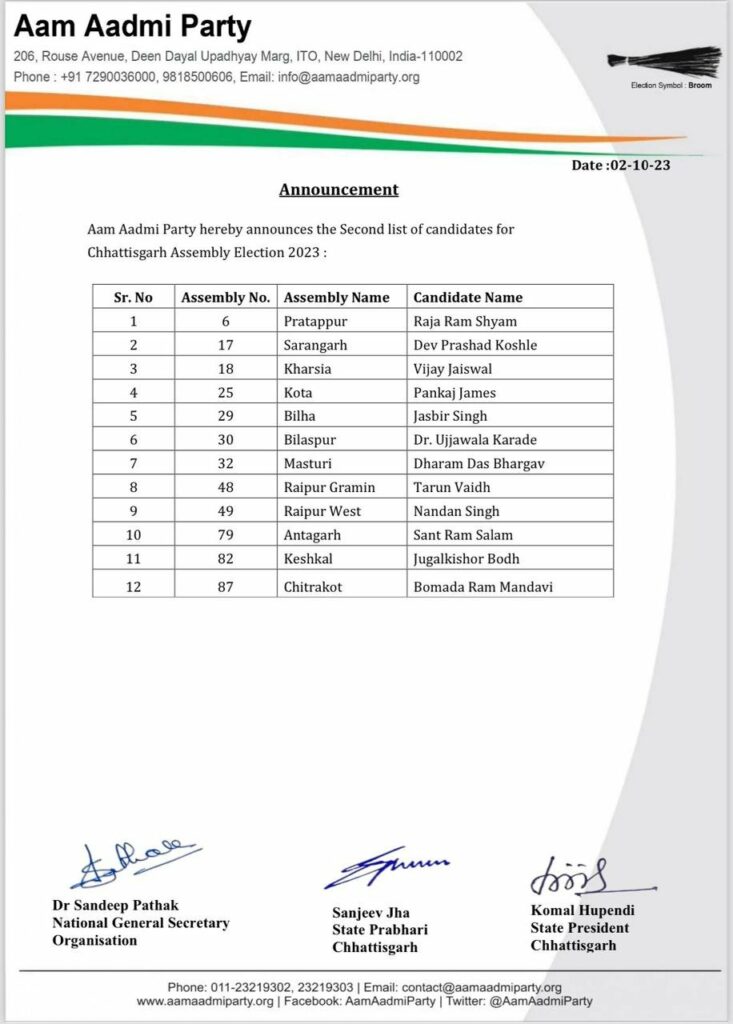 CG Assembly Candidate List Issued: चुनावों के पहले राजनीतिक दलों के बीच आरोप-प्रत्यारोप का दौर जारी है वही सियासी दल अपने अपने उम्मीदवारों की सूची भी जारी कर रहे है। बात करें छत्तीसगढ़ की तो आम आदमी पार्टी ने अपनी दूसरी लिस्ट जारी कर दी है। देखें सूची..