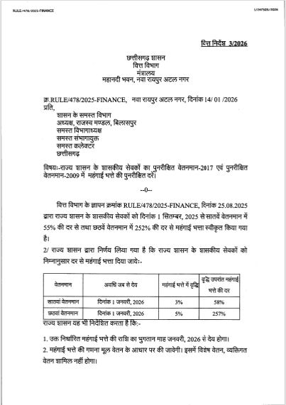 - छत्तीसगढ़ सरकार ने महंगाई भत्ते में 3% बढ़ोतरी का आदेश जारी किया