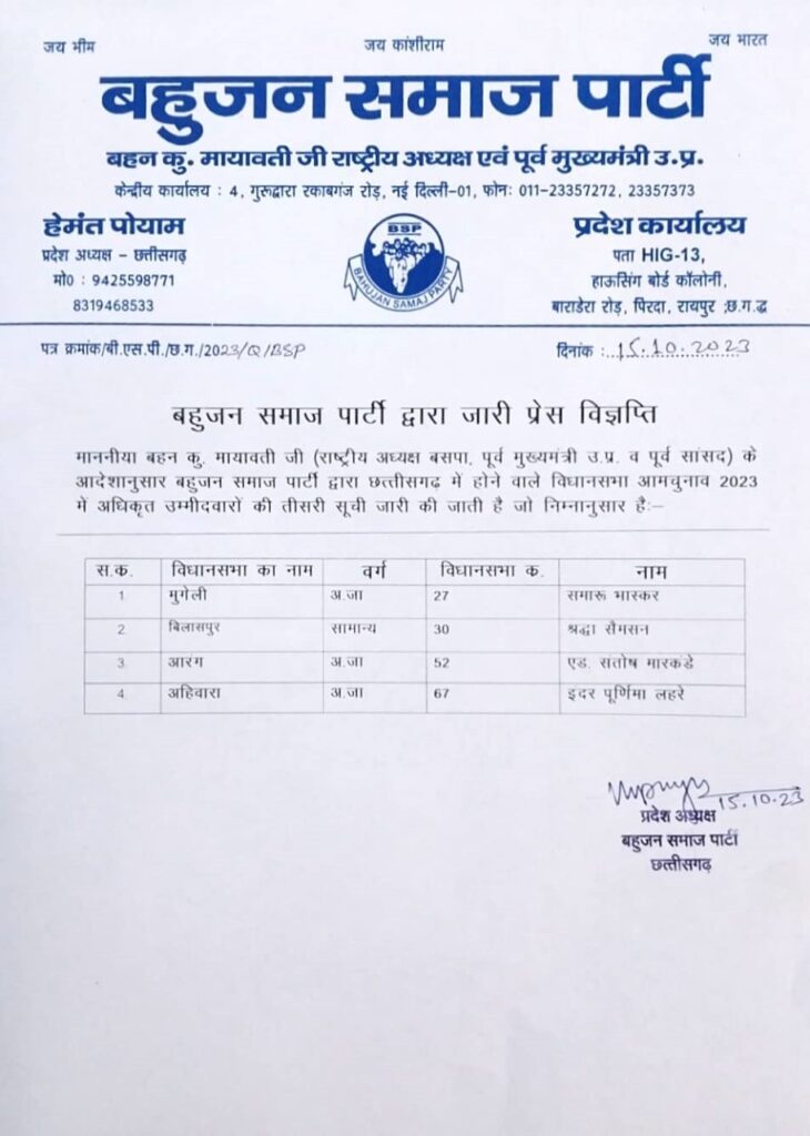 CG Election BSP Candidate List बहुजन समाज पार्टी की लिस्ट जारी.. बिलासपुर, आरंग समेत 4 सीटों पर नाम फाइनल