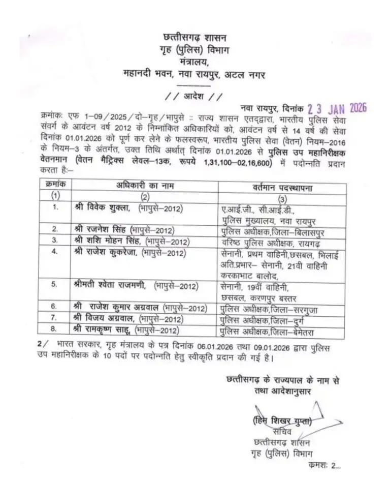CG IPS Promotion News आईपीएस रजनेश सिंह, शशिमोहन सिंह, राजेश अग्रवाल और विजय अग्रवाल समेत 8 अफसरों को प्रमोट करके डीआईजी बना दिया गया है। सलेक्शन ग्रेड मिलने के बाद जिलों में पोस्टेड एसपी का पदनाम बदलकर एसएसपी हो जाएगा। इनमें जितेंद्र शुक्ला, मोहित गर्ग, यशपाल सिंह, अभिषेक पल्लव और भोजराम पटेल हैं। भोजराम इस समय मुंगेली के एसपी है।