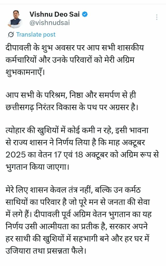 यह राज्य के लाखों कर्मचारियों के लिए बड़ी खुशखबरी है। इस माह का वेतन 17-18 अक्टूबर को भुगतान होगा। इसलिए सभी कोषालय-उपकोषालय 18 अक्टूबर को भी खुलेंगे ताकि कर्मचारियों को वेतन प्राप्ति में सुविधा हो सके। सीएम विष्णु देव साय ने इसके लिए एक्स पर पोस्ट कर जानकारी दी है।