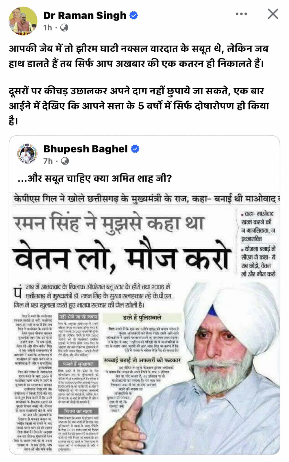 CG Politics on Naxalism: दरअसल, पूर्व मुख्यमंत्री भूपेश बघेल ने सोशल मीडिया पर एक अखबार की कटिंग शेयर की है, जिसमें रमन सिंह के सुरक्षा सलाहकार रहे केपीएस गिल का साक्षात्कार है। भूरपेश ने इसे शेयर करते हुए लिखा है कि ..और सबूत चाहिए क्या अमित शाह जी? इसे लेकर विधानसभा अध्यक्ष रमन सिंह ने सोशल मीडिया पर प्रतिक्रिया देते हुए लिखा कि “आपकी जेब में तो झीरम घाटी नक्सल वारदात के सबूत थे, लेकिन जब हाथ डालते हैं तब सिर्फ अखबार की एक कतरन ही निकलती है।” उन्होंने आगे कहा कि दूसरों पर कीचड़ उछालकर अपने दाग नहीं छुपाए जा सकते। रमन सिंह ने अपने बयान में भूपेश बघेल को आईना देखने की नसीहत देते हुए कहा कि सत्ता में रहते हुए उन्होंने केवल दोषारोपण की राजनीति की है।