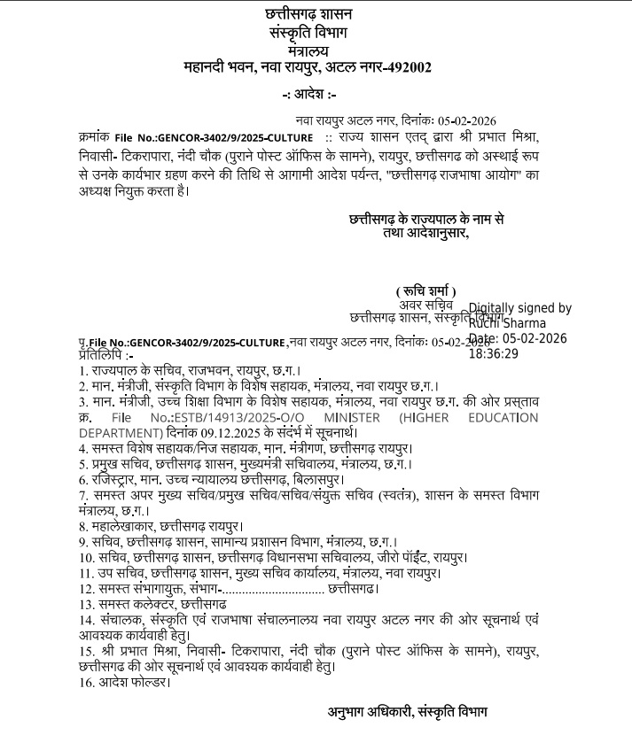 CG Rajbhasha Aayog President: लंबे समय बाद राजभाषा आयोग को मिला नया अध्यक्ष, रायपुर के प्रभात मिश्रा को मिली जिम्मेदारी, सरकार ने जारी किया आदेश