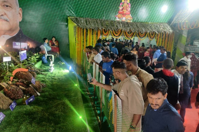 CG rajyotsava and tribal dance festival : जीवंत प्रदर्शनी में फूलों में साथ ही केला, कोकोआ, बैंगन, टमाटर, मिर्च आदि के पौधों की भी जीवंत प्रदर्शनी लगाई गई। ऑयल पॉम के पौधे की प्राइमरी स्टेज, सेकेंडरी स्टेज उत्पादन दर्शाया गया है जिसमे छोटे पौधे से लेकर बड़े झाड़ तक जीवंत प्रदर्शनी में दर्शाया गया है। साथ ही ऑयल पॉम के झाड़ एवम उसके फल से बने प्रसंस्कृत उत्पाद भी प्रदर्शित किए गए। उद्यानिकी विभाग के स्टॉल में उच्च गुणवत्ता वाले विभिन्न किस्म के पौधे, मशरूम, उद्यानिकी के प्रसंस्कृत उत्पाद जैसे जैम, आचार, सॉस, नेक्टर आदि स्टॉल पर विक्रय हेतु उपलब्ध कराए गए जिसकी खूब बिक्री हो रही है।