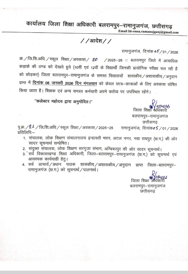 बलरामपुरः CG School Closed Tomorrow छत्तीसगढ़ के उत्तरी हिस्से में इन दिनों कड़ाके की ठंड पड़ रही है। शीतलहर और बढ़ती ठंड के असर को देखते हुए प्रशासन ने एहतियातन बड़ा कदम उठाया है। बलरामपुर जिले में अब स्कूलों की छुट्टी कर दी गई है। जिले में मंगलवार को 12वीं तक के सभी स्कूलों को बंद कर दिया गया है। कलेक्टर के मिले निर्देश के बाद इस संबंध में जिला शिक्षा अधिकारी ने आदेश जारी कर दिया है।