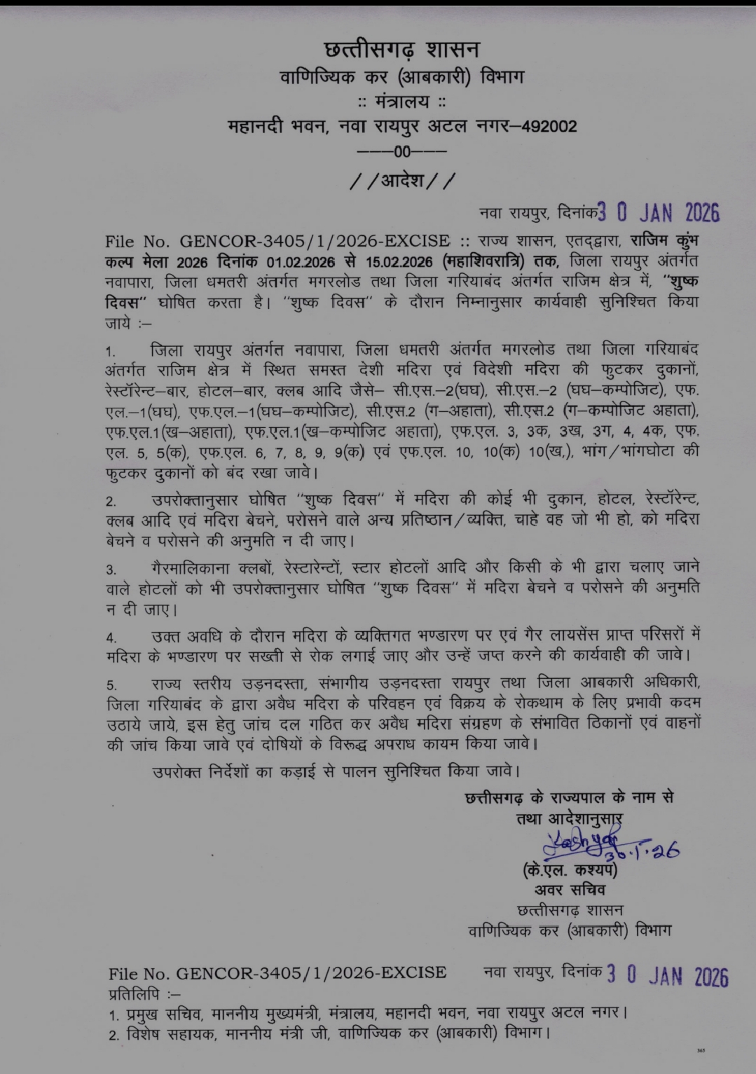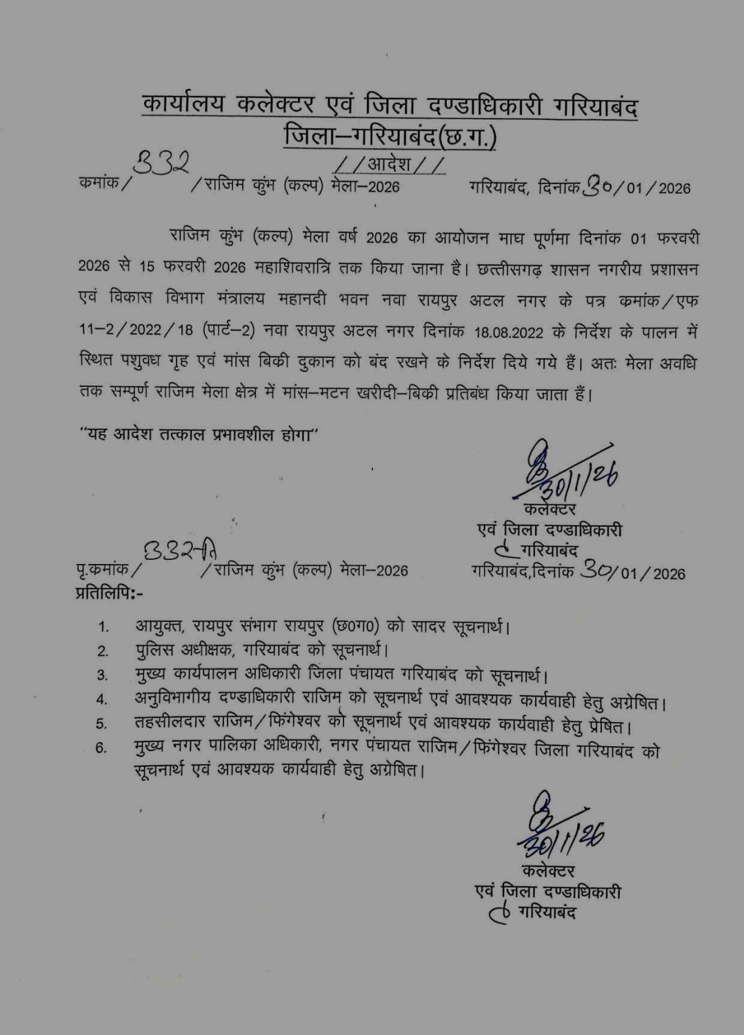 CG Sharab Dukan Band News जारी आदेश के तहत 1 फरवरी से 15 फरवरी तक राजिम क्षेत्र की सीमा में मांस-मटन की बिक्री पूरी तरह बंद रहेगी। वहीं श्रद्धालुओं की आस्था और धार्मिक मर्यादा को ध्यान में रखते हुए राजिम, गोबरा नवापारा और मगरलोड क्षेत्र की सभी शराब दुकानें भी इस अवधि में बंद रहेंगी।